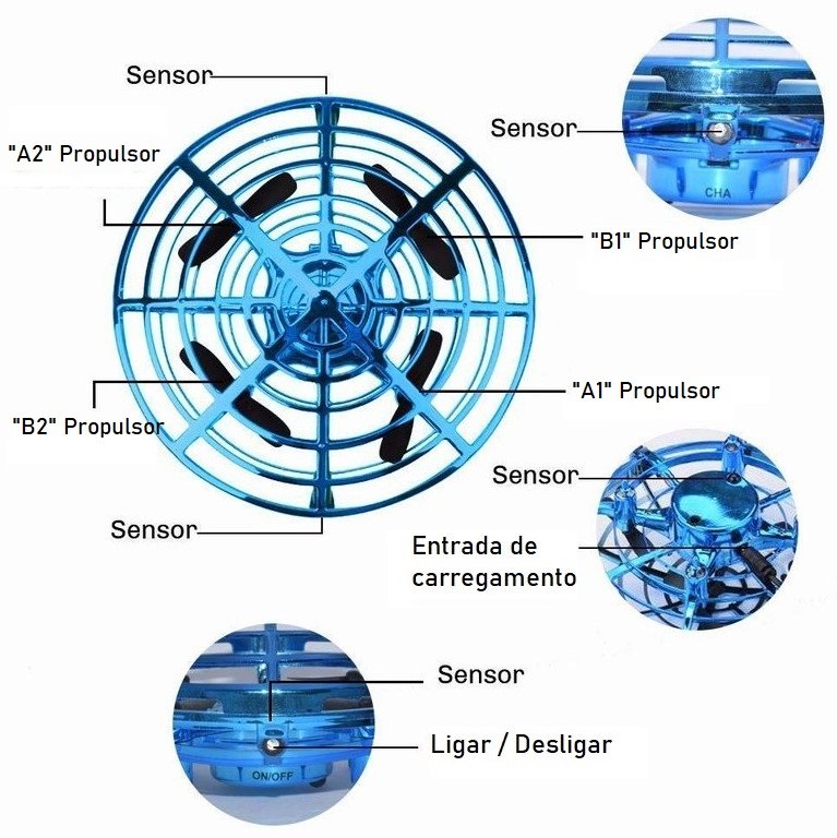 O Mini Drone de alta tecnologia, lembra um disco voador vindo do espaço. Ele pode se manter suspenso no ar e também voar em todas as direções estando em atividade, com uso de seus sensores indutivos.